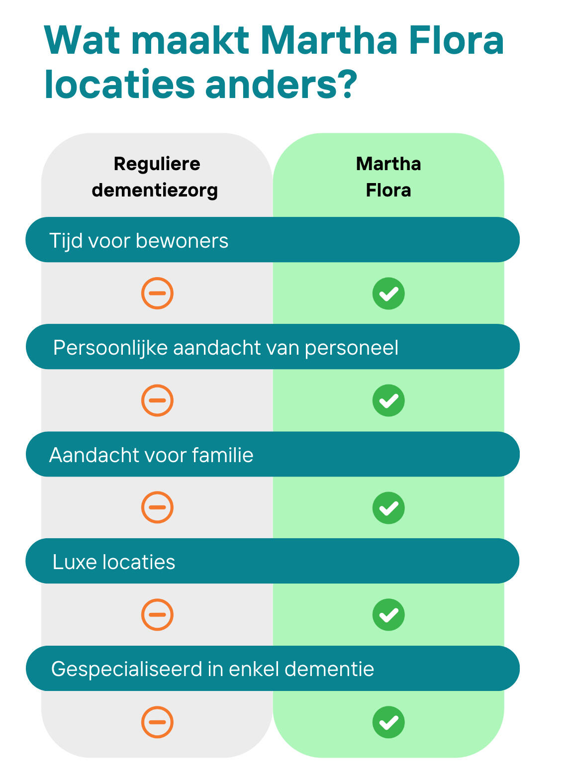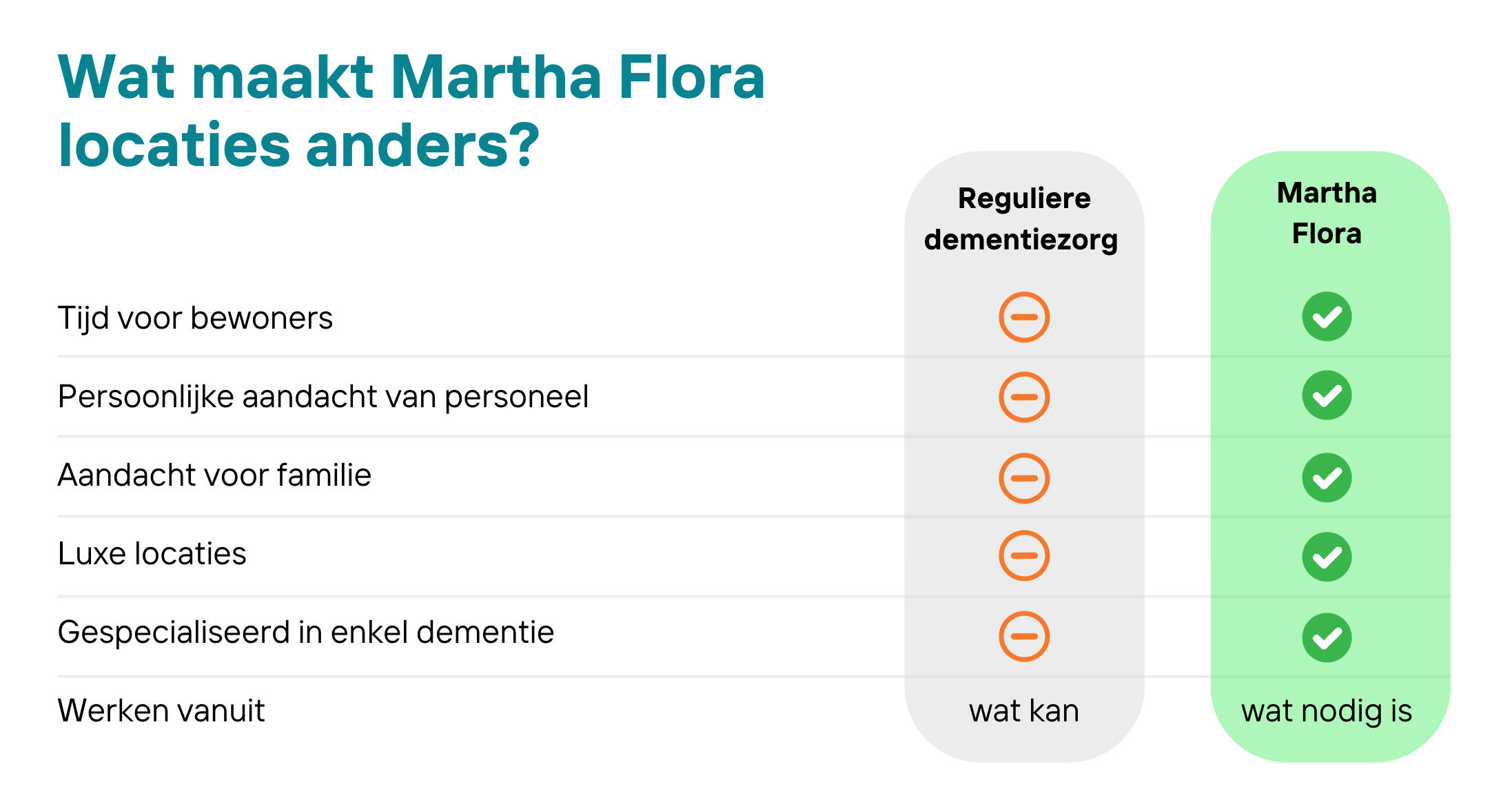 Dementie is complex en kent vele vormen. Goede dementiezorg kun je alleen bieden als je, zoals Martha Flora, volledig gespecialiseerd bent.